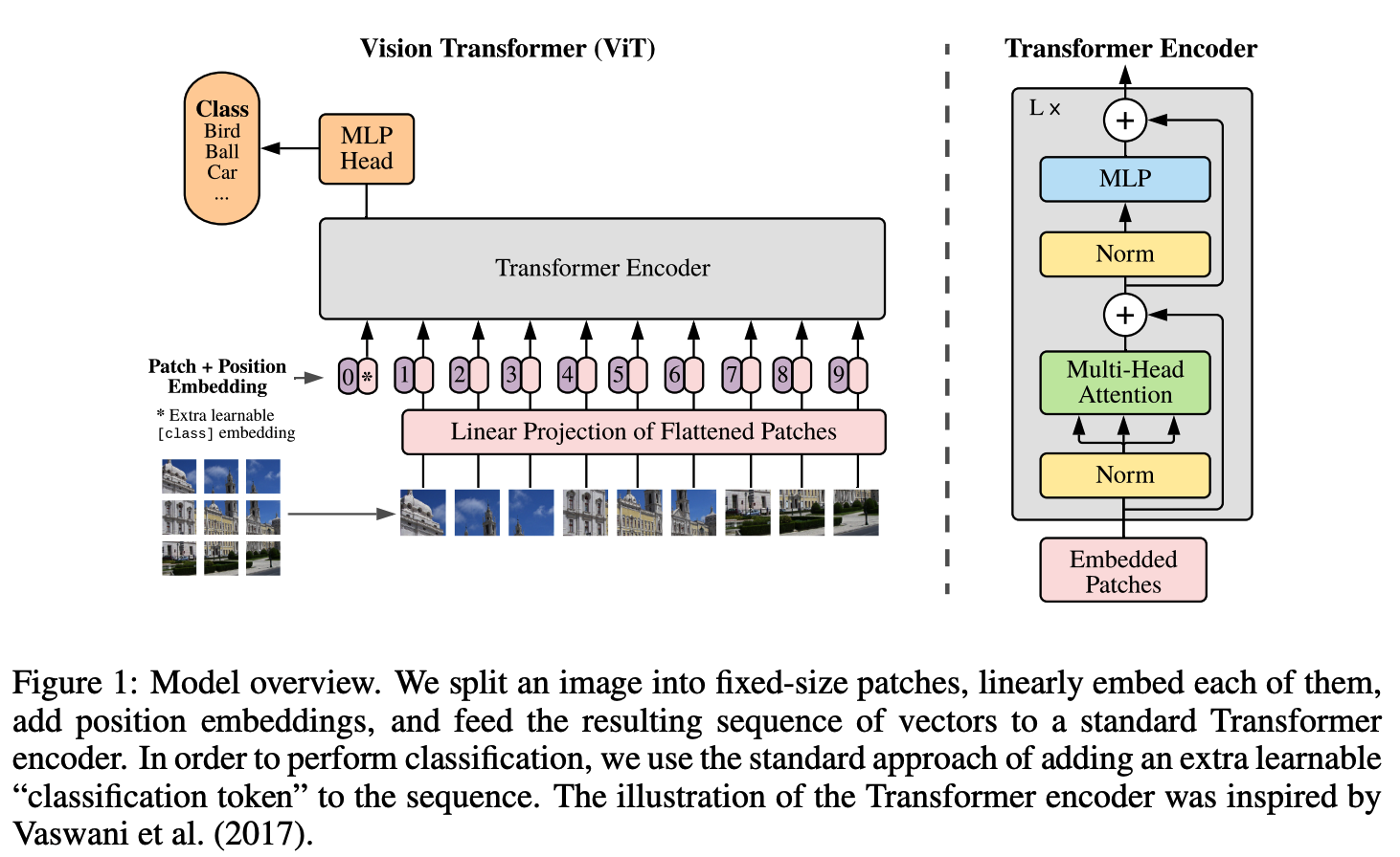 - 방법요약: patch로 이미지를 잘라서(or CNN으로 feature map 생성해서-hybrid architecture) 1dim으로 flatten 시키고 (Transformer가 1d를 input으로 받음) 각 patch별로 position embedding을 붙여서 transformer에 넣는다. (idea는 단순함)