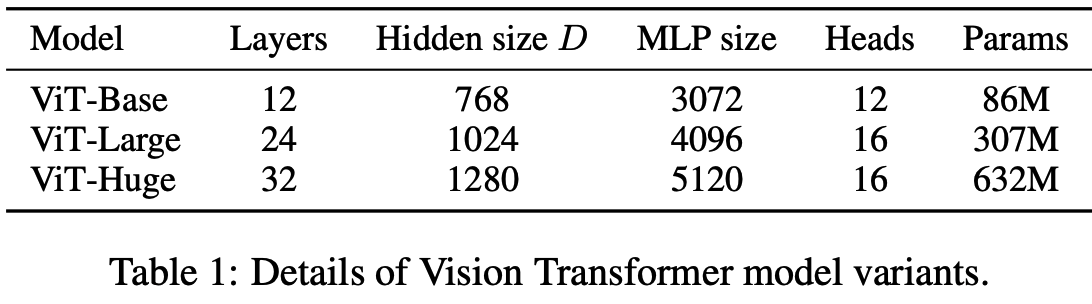 Note that the Transformer’s sequence length is inversely proportional to the square of the patch size, thus models with smaller patch size are computationally more expensive.