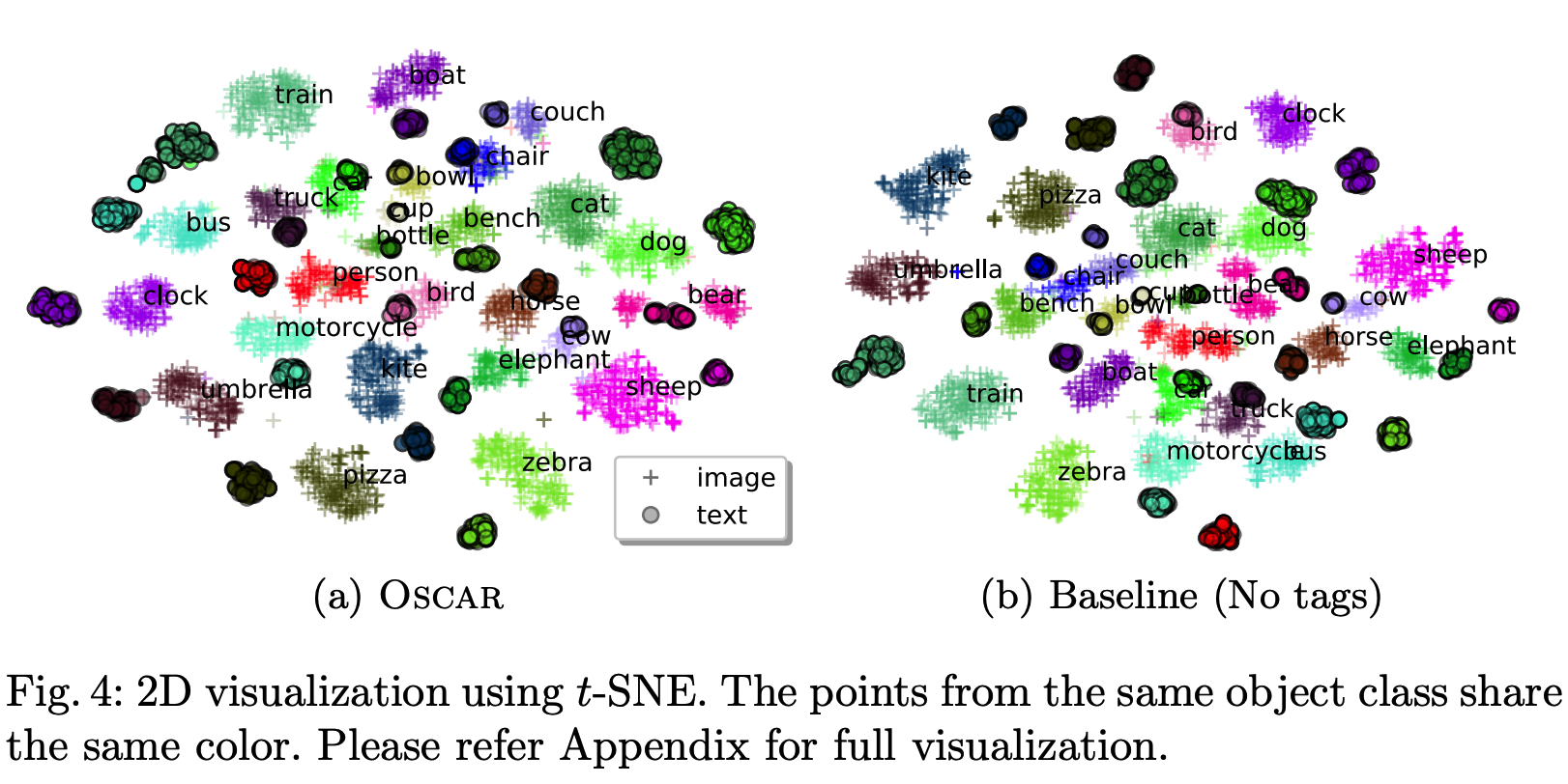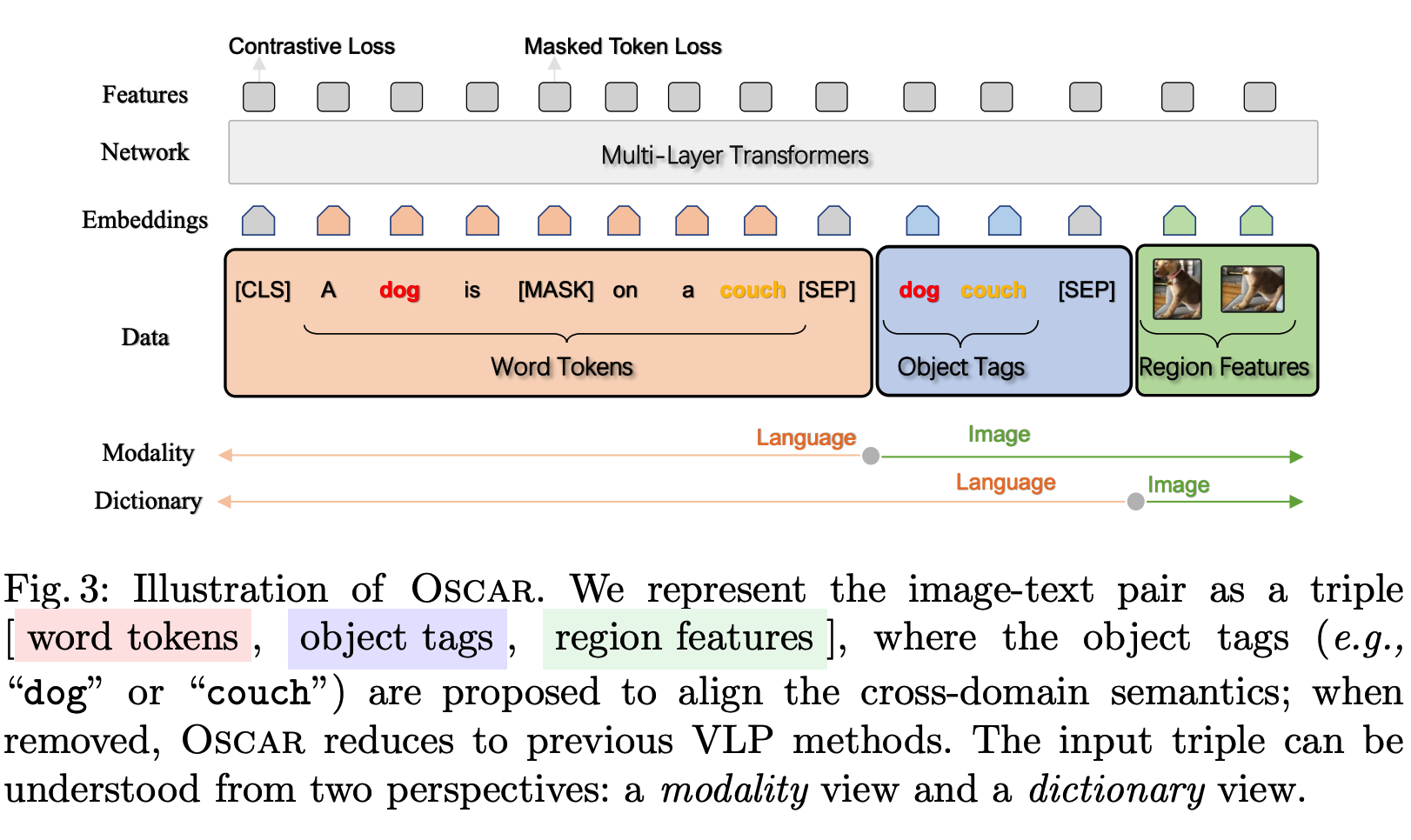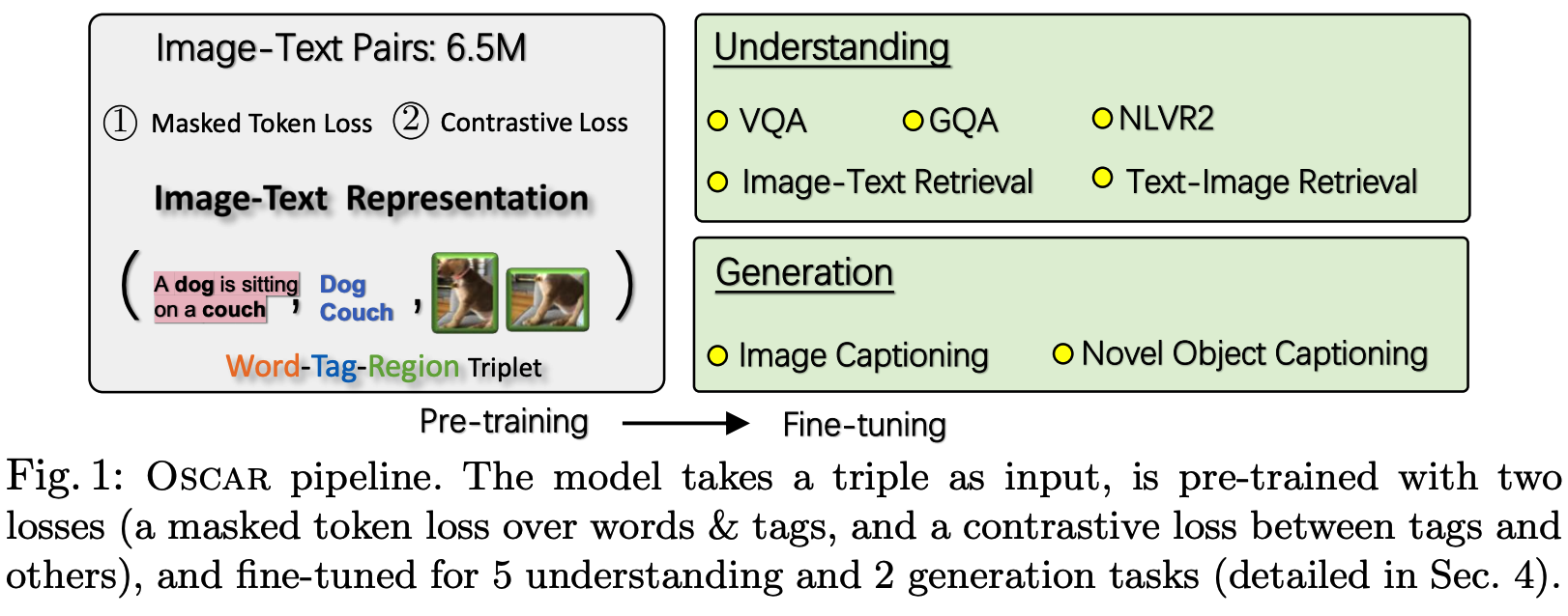 object tags를 (공유된 semantic space에서 image와 language modalities를 결합하는) anchor points로 사용하는 새로운 pre-training 방법인 OSCAR를 소개했다.
