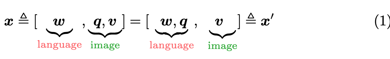 (w: text's word embeddings sequence, q: object tags(image에서 detect된)의 word embedding sequence, v: image's region vectors set)