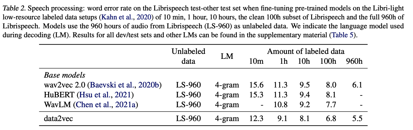 - modality specific: data2vec에서는 feature 추출하는 부분까지만 각각 task별로 다르게 생성